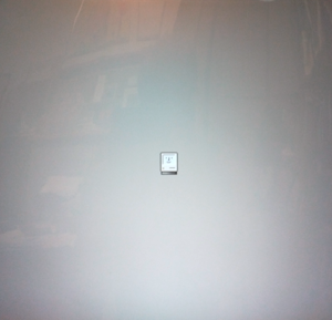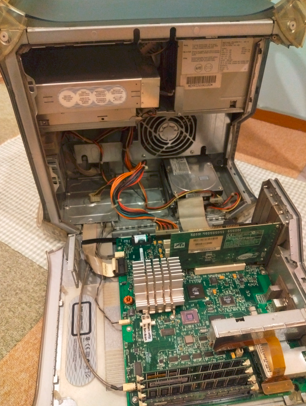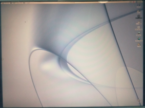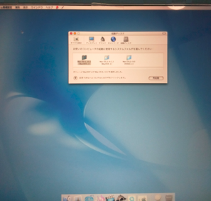 G4内部のサーキットを再度チェックして問題点を確認していったところ、内臓電池の問題に気が付いた。かなりの長期間、メンテナンスなしで放置されていたらしいので、内部のすさまじい汚れもあったわけだが。当然ながら、内臓電池の寿命も切れているだろうと推測。電池交換してみた。この状態で、あらためてスイッチを入れてみたところ、モニターが立ち上がり、同時にOSも立ち上がってきた(写真下)。