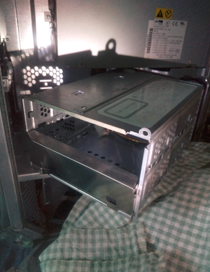 G4内部を確認。グラファイトG4に比べて若干ユニットの配置変更があり洗練されスマートになっています。内臓ディスクドライブの位置は同じ。パワーユニットの機種と配置の変更がありますが、グラファイトG4より取り替え操作が楽になるように配置されているのか。内蔵ドライブユニットを取り外した(写真下)。