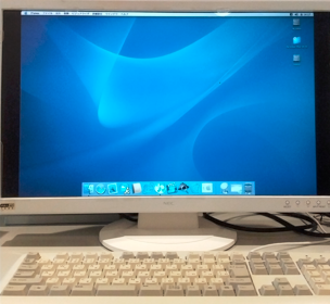 今回 power mac G4 を2台入手した。一台は第1世代のグラファイトG4。もう一台は後期型になる ”Mirrored Drive Doors”G4。グラファイトG4は状態が非常に悪かったのでクリーニング&レストアして作業に耐えうるものに仕上げた。現在OSもOSX10.3までバージョンアップしている(写真下)。モニターがやや暗く中央やや右上端に欠損部が見えるのはブラインドフィルムを取り付けているため。very