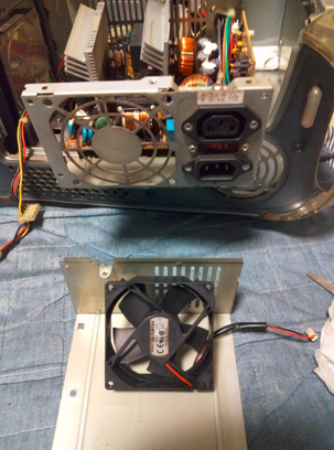 冷却ファンがススだらけだったのでパーツを取り外し洗浄。パワーユニットも内部がかなり汚れて、ユニット内部の冷却ファンも真っ黒に汚れていたので、加熱の原因になると思われた。パワーユニットを取り外し、これも分解洗浄クリーニングした。