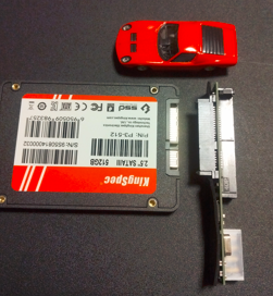 SATA-IDE接続端子届きました。新しいディスクドライブのSATA端子とIDEデータ・電源サプライ端子にうまく接続できそうです。つないでみました(写真下)。