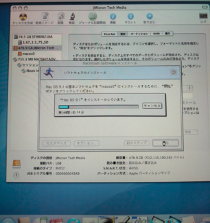 book G4 を1台入手していたので。こちらは状態かなり良くて、つないでみたところSSDちゃんと認識されました。それで、こちらからOS9をインストール。これもうまくいきました(写真下)。